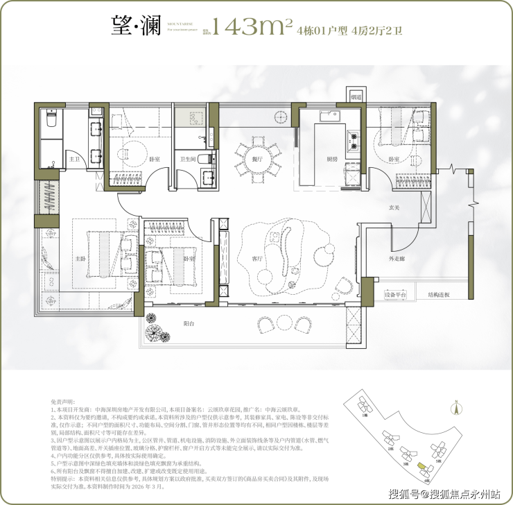 户型详情:项目规划5栋23-25层住宅,限高80米,其中1-4栋为25层,一层四户设计;5栋为23层,一层五户设计,梯户比为2梯4户(1-4栋)、2梯5户(5栋),户户朝南,带高品质精装交付,新规设计使得得房率近100%(含赠送),大部分户型可无遮挡观赏梅林山山景,主力户型为106-143㎡纯四房(部分户型可灵活改造),适配改善家庭需求。