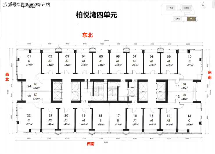 梯户比:5梯24户 楼层:1、2单元43层,3、4单元48层