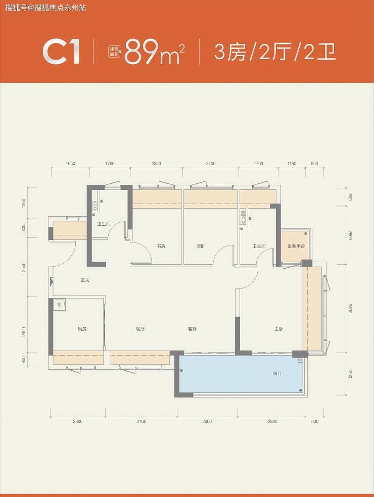 89㎡三房两卫:折后总价272-289万,单价3.05-3.25万/㎡,得房率约101%。