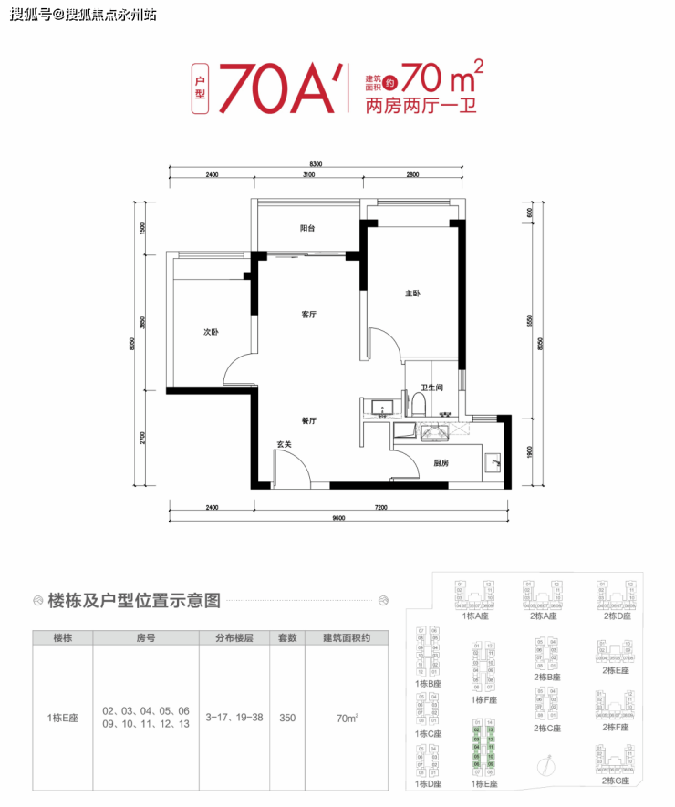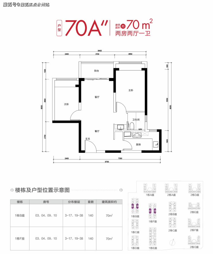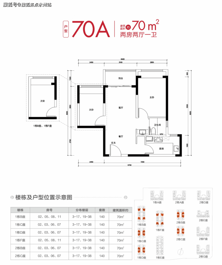 70㎡两房:2742 套,总价255万-316万,单价3.7万 /㎡起。主力户型为“双龙抱珠”设计(70A)和传统竖厅(70B),动静分区明确,卧室带飘窗,卫生间干湿分离。
