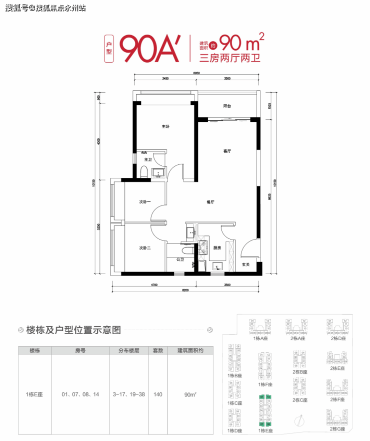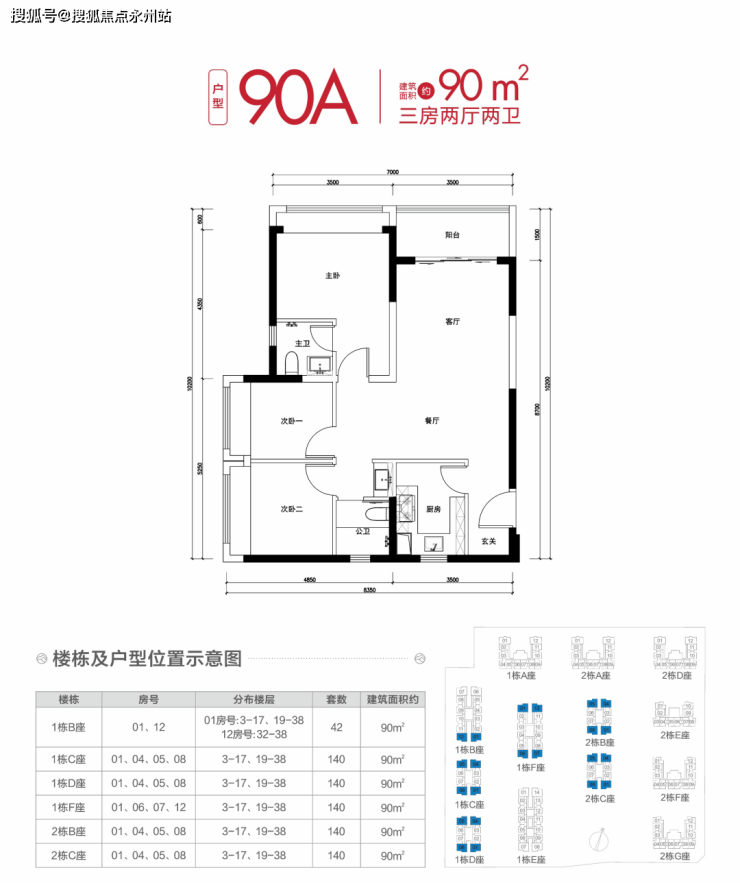 90㎡三房:898套(含97套无障碍户型),总价341万-410万。户型为大横厅设计(90B)或动静分区竖厅(90A),主卧套房配置飘窗,部分端头位户型采光通风更佳。