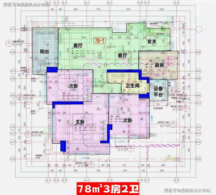 78㎡3房2厅1卫:经典竖厅设计,客厅开间3.3米,LDKB 一体化布局,S墙预留冰箱位,动静分区明确。