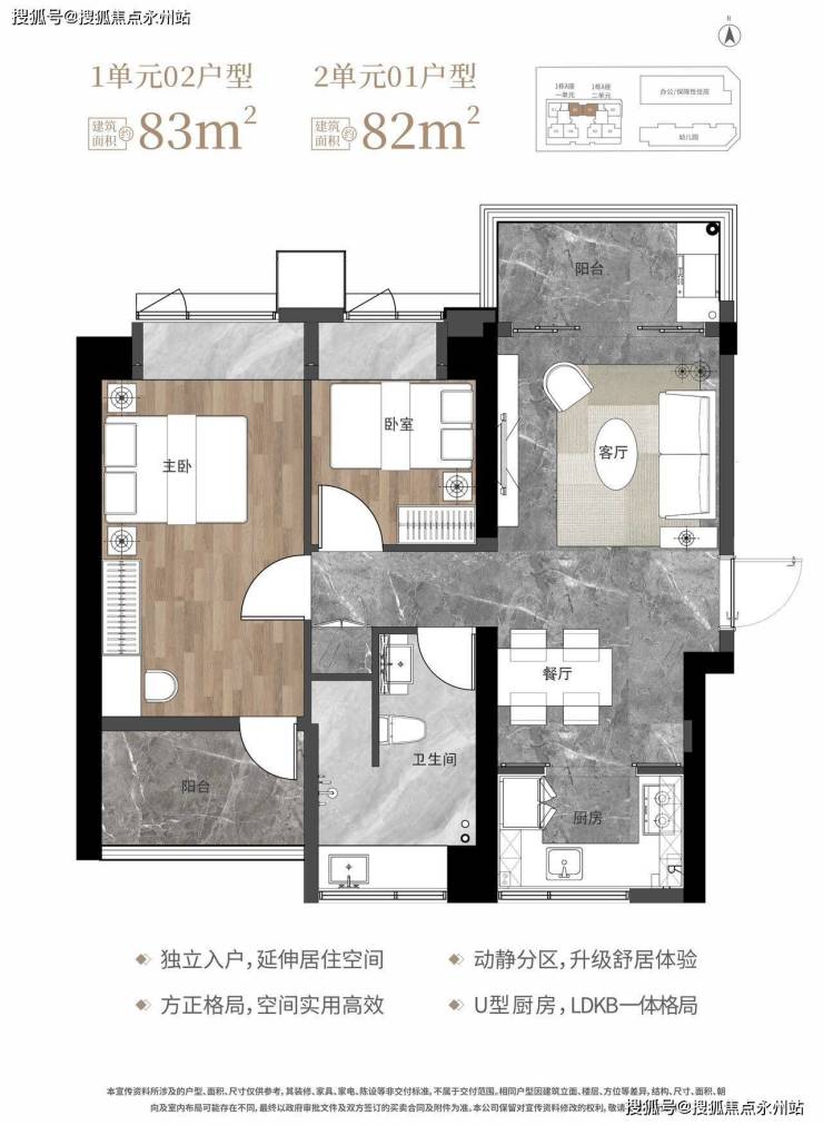 格局A(1栋2单元02户型)南北通透竖厅:独立入户,客厅开间3.6米,客餐厅分离,U 型厨房外接北向生活阳台,主卧套房含独立卫浴(干湿分离),适合注重隐私的家庭。