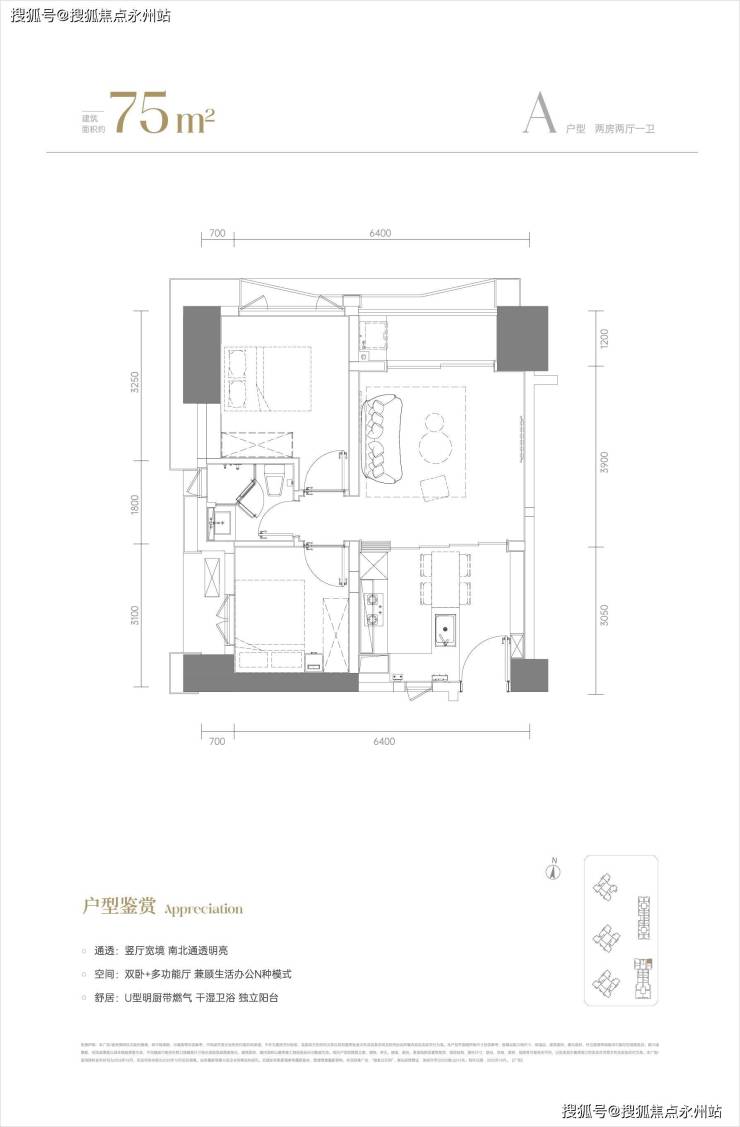 75㎡大两房,南北通透,双阳台设计(景观阳台+生活阳台),客厅开间4.2米,主卧套房设计(含独立卫浴+衣帽间)。