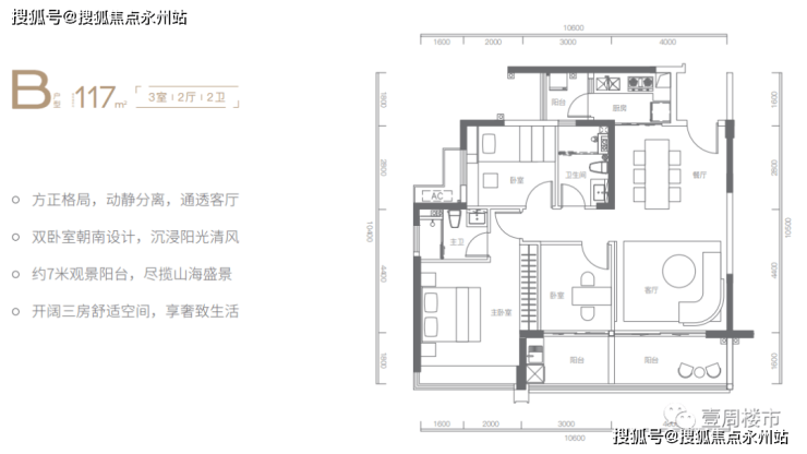 建面约117㎡三房两厅两卫,8米宽景阳台,户型方正,采光通透,双卧室朝南设计,主卧带3.6m宽景飘窗。同时,客厅与次卧阳台连通,宽度达约7m,一线瞰海采光无比舒适!