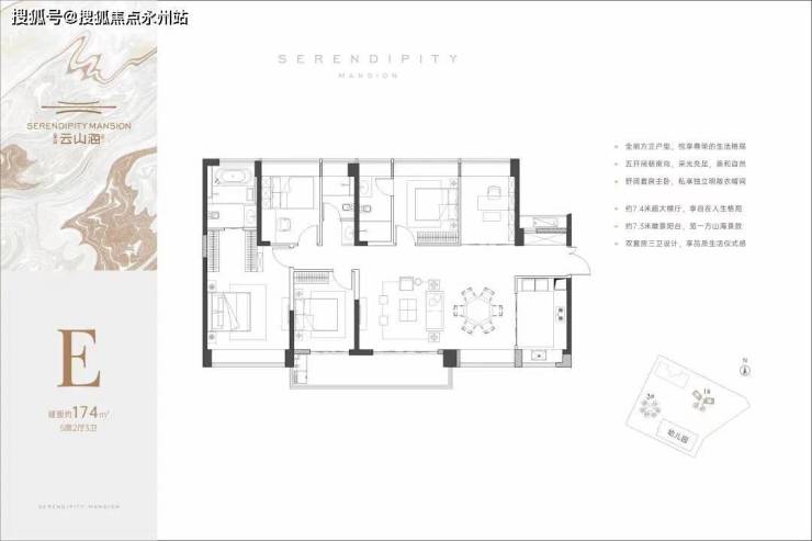 174㎡的5房2厅3卫:分布在1栋的01.02户型,设计的是横厅格局,客餐厅一体化7.4米开间,客厅连接次卧出大阳台(7.3米长),三开间朝南,全屋飘窗,双套房设计,卧室宽度分别为4/3.2/3/2.9/2.6米,U型厨房,公卫三段式分离,阳台主朝西南向。