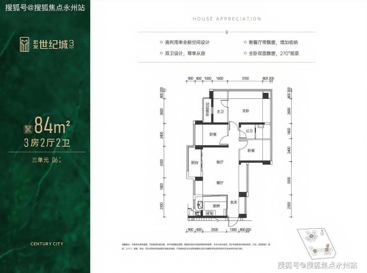 84㎡三房两厅两卫:折后总价335-400万/套,单价3.96-4.45万/㎡(赠送面积22.8㎡,实际使用面积约103.32㎡,得房率103.32%)。