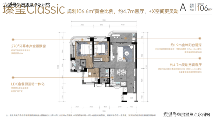 ◉客餐厅南北通透、超大面宽、采光通风好。横厅格局设计,客餐厨一体化,开间进深达到豪宅的开间尺度,可看河景。