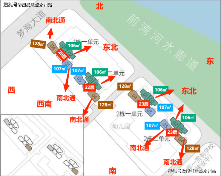 每个面积段的户型,在四栋楼中都有分布,其中景观面最好的是106平的01/02户型,正看一线河景,未来无遮挡