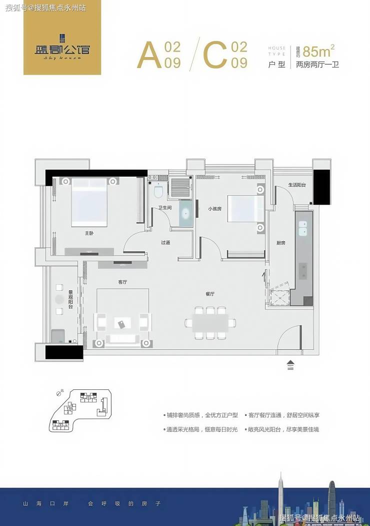 建面85-86㎡2房2厅1卫(A/C栋):端头户型,双面采光,动静分区合理。客厅与餐厅独立且连通景观阳台,主卧带飘窗,次卧可作为儿童房或书房。部分房源双阳台设计,提升空间通透感。
