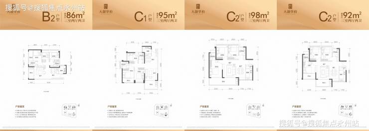 95-98㎡:横厅设计,主卧 13.8㎡,正南朝向,得房率 90% 以上。
