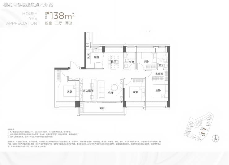 设计亮点:客餐厅开间 6 米,6 米景观阳台连接 LDKB 空间,主卧 270° 飘窗可改造为衣帽间,全屋 9 个飘窗设计。