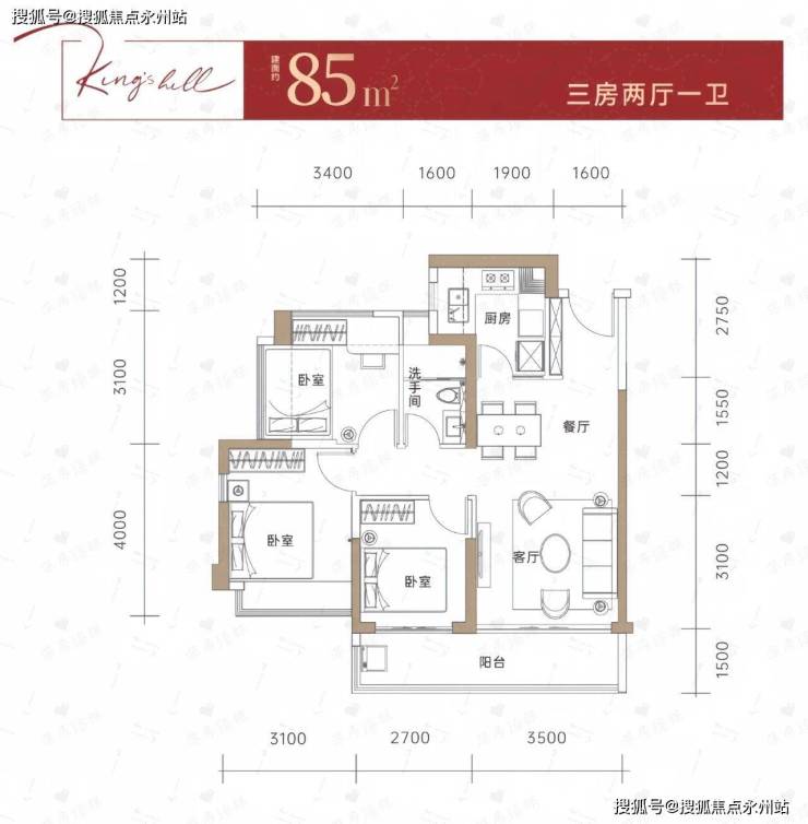95㎡的3房2厅2卫,设计的是经典竖厅格局,客厅3.6米开间,LDKB一体化设计,三开间朝南,动静分区,3个卧室分别做到了主卧14.2㎡/次卧10.49㎡/次卧8.37㎡(包含墙体飘窗),客厅连接次卧出6.3米长的观景大阳台,U型厨房,卫生间干湿分离,得房率约75%(不含赠送),西南或东南朝向。套内面积71.25㎡+赠送面积11.92㎡=实得83.17㎡,加上赠送得房率约87.54%。