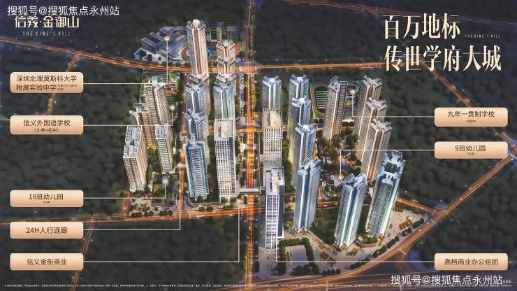全龄段教育链:自带2所幼儿园(18班+9班),2025年9月开园,信义外国语学校(九年一贯制)与深圳外国语学校合作办学,2025年9月正式招生,提供27班小学+18班初中。