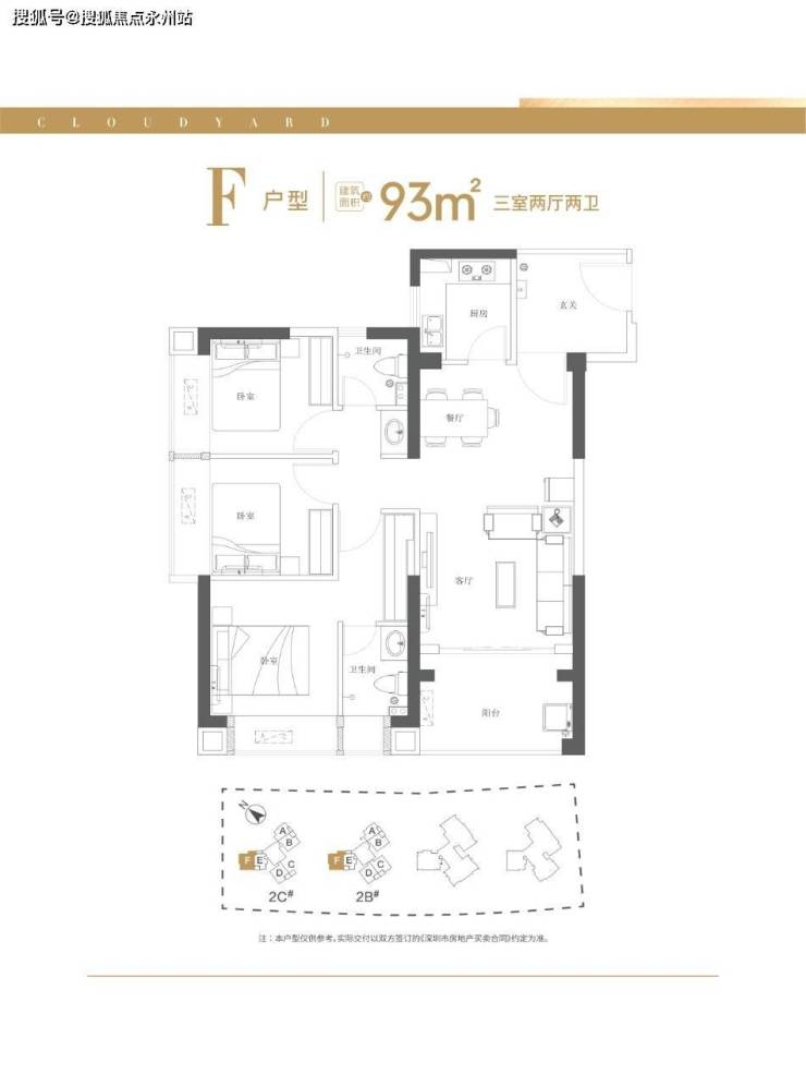 建面约93㎡ 三室两厅两卫:私享入户花园、户型方正、全屋山景。