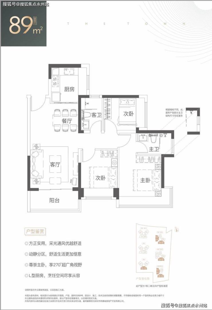 89㎡的3房2厅2卫,设计的是经典竖厅格局,客厅3.6米开间,LDKB一体化设计,动静分区,3个卧室分别做到了3.2米/2.7米/2.5米的宽度,主卧270°超广角视野,L型厨房,卫生间干湿分离,得房率:76.33%(不含赠送),有西北或西南朝向。