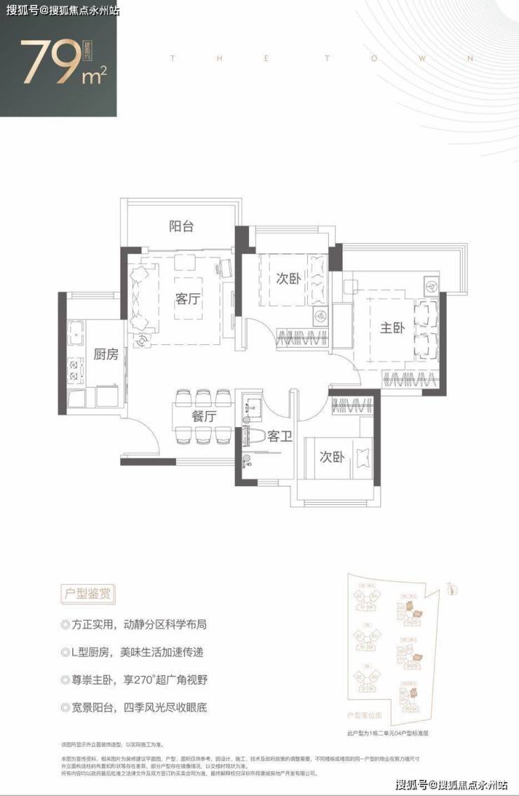 79㎡的3房2厅1卫,设计的是竖厅南北通透格局,客厅3.6米开间,LDKB一体化设计,动静分区,四开间朝南,主卧270°超广角视野,L型厨房,卫生间干湿分离,得房率:76.33%(不含赠送),东南朝向。
