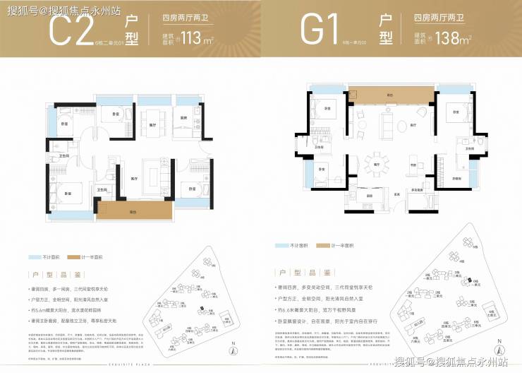 138㎡(G1户型)设计格局:竖厅“双龙抱珠”格局,客厅开间6.6米,可改5房,东北朝向,得房率:72.38%(不含赠送)