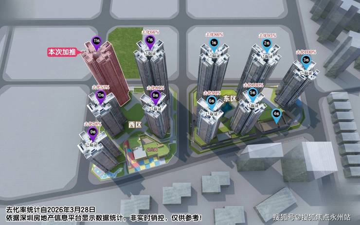项目位于龙华区民治街道梅观大道东侧,地处深港科创中轴核心区域,是龙华连接福田中心区的“南大门”,总占地面积约4.33万㎡,总建筑面积约31万㎡,规划10栋住宅楼,分为东西两大园区,合计1992套房源,配2155辆车位,容积率5.37,绿化率40%,