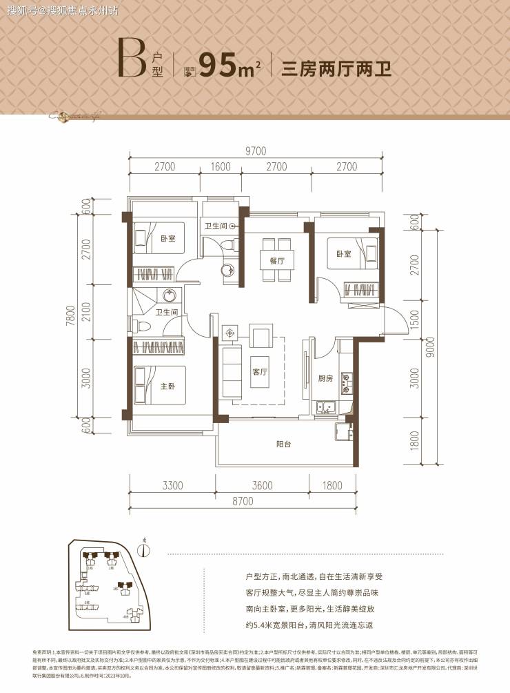 95㎡的3房2厅2卫,设计的竖厅南北通透格局,客厅3.6米开间,动静分区,L型厨房。