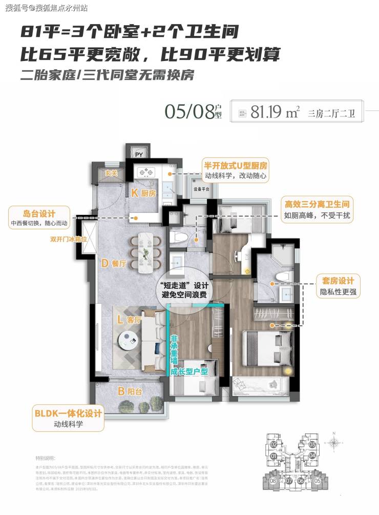 高得房率:新规设计下,得房率达88-91%,显著高于传统户型。例如,65㎡户型实用面积接近70㎡传统户型水平。