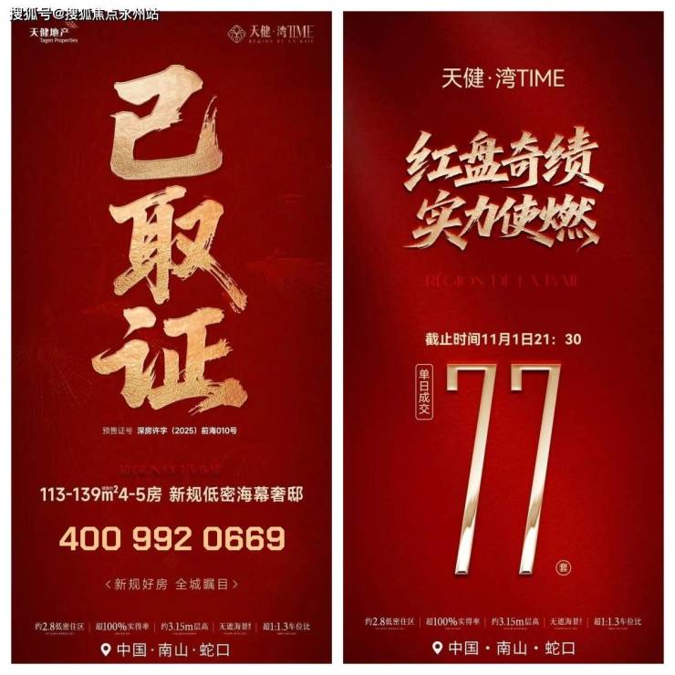 南山赤湾,天健湾时代府「天健·湾TIME」于2025年10月31日取证入市,11月1日(周六)直接开盘,289套面积约为113-115㎡四房和139㎡五房,合同约定在2028年6月30日带精装交付。