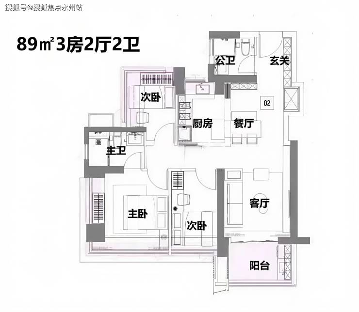 89㎡3房2卫:三房空间的华丽升级这款89㎡的户型,将三房的空间感和舒适度提升到了新的高度,让你以三房的价格享受到改善豪宅的体验