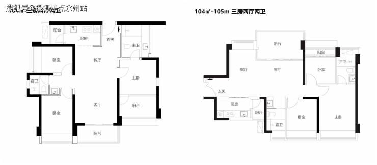 【104㎡3房2卫户型】双龙抱珠户型,奢阔舒适三房全明户型,三面采光,看中心园林景观