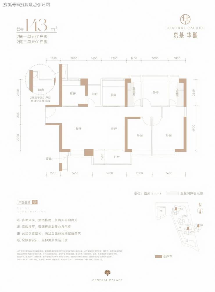 居住品质丨户型设计:主推95-222㎡三至五房,采用竖厅格局、LDKB 一体化设计,得房率约 73%,部分户型配备 6 米大阳台和全屋飘窗。