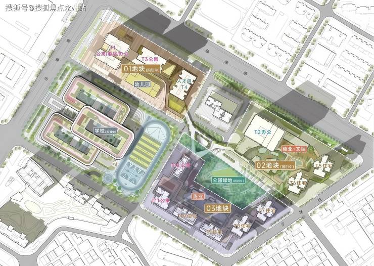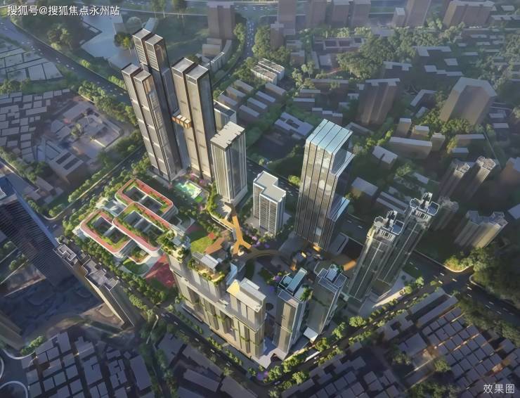 总规模:总占地 9.6 万㎡,总建面 103 万㎡,由四个地块组成,分两期开发,涵盖住宅、公寓、商业、办公、酒店、学校等八大业态。