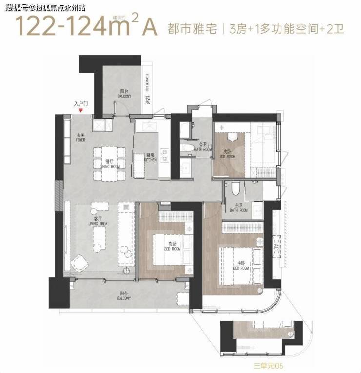 建面约111㎡三房两厅两卫:东南朝向,动静分区,主卧带衣帽间 + 三分离卫浴,6.7米景观阳台,总价门槛低。