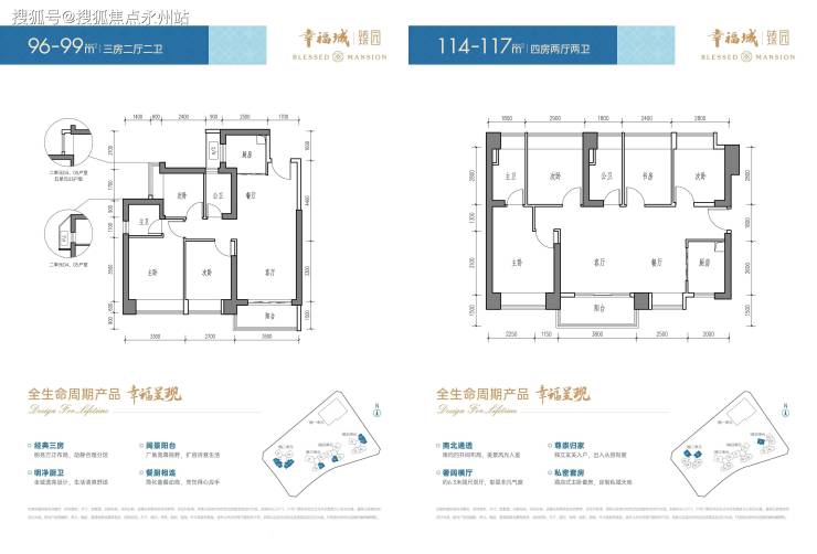 96-99㎡3房2卫:经典竖厅布局,客厅开间3.5米,LDKB 一体化设计,得房率约81-84%,东南/西南或东北朝向。