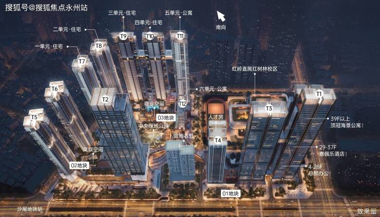项目共分4个地块,01地块为T1栋260米高的写字楼,有高端酒店、金地总部等39层以上是450平以上的公寓。T3栋为商务公寓。另外两栋分别是人才房和幼儿园。