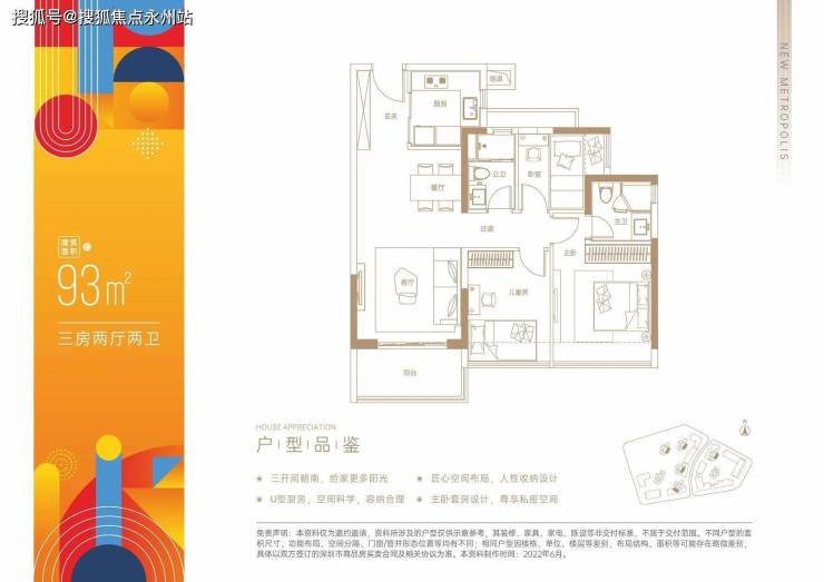 93平3房2厅2卫:经典竖厅设计,使用率77.66%(不包含赠送面积)