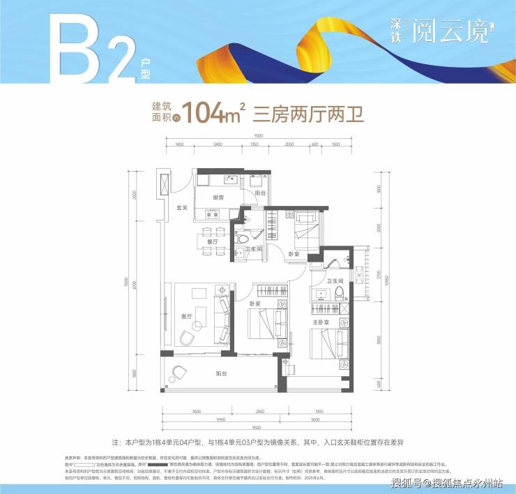 B2户型-104㎡三房两厅两卫,分布在1栋4单元03、04号房,主要为南向,部分为东向或西向,经典竖厅设计,三开间朝南。