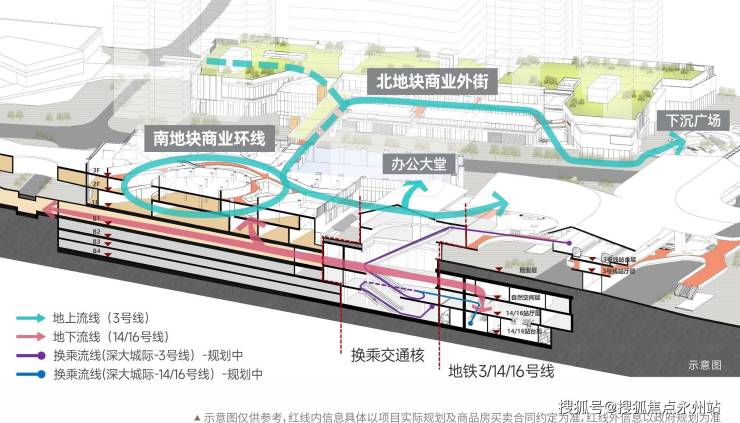 项目乃是大运交通枢纽之上盖物业,以龙飞大道为界,分为南北两期进行开发,且有空中连廊彼此相连。北区精心打造住宅小区,南区则充分兼顾公共性与便捷性,主要规划有超高层办公写字楼以及大型商业 mall。