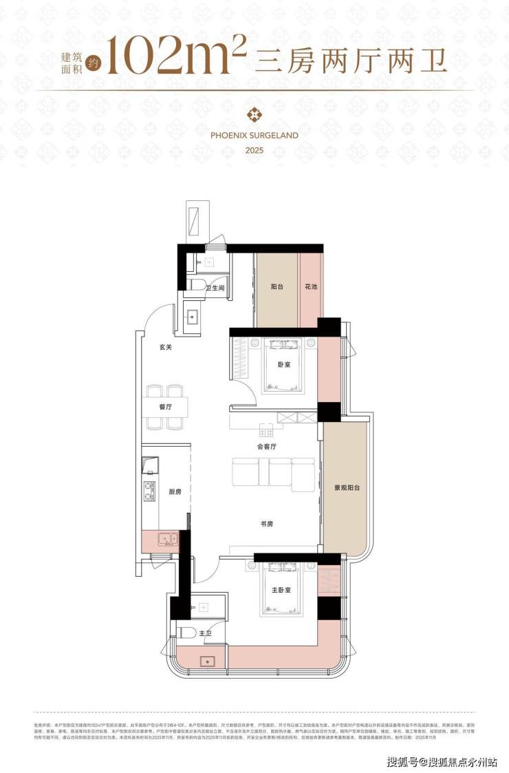 入门级舒适三房:建面约102-111㎡(3房2厅2卫)该档位为项目低门槛户型,仅13层以下供应,主打“高性价比+实用主义”,适合首次置业或投资客群,得房率约94%-105%。