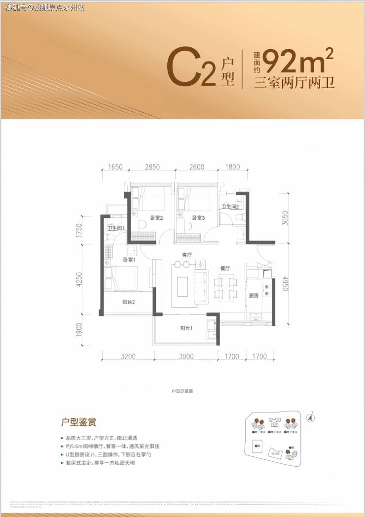 厨卫:U型厨房,卫生间干湿分离。