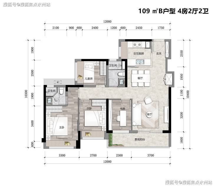 建面约109㎡B户型4房2厅2卫:总价950万左右,首付约315万。