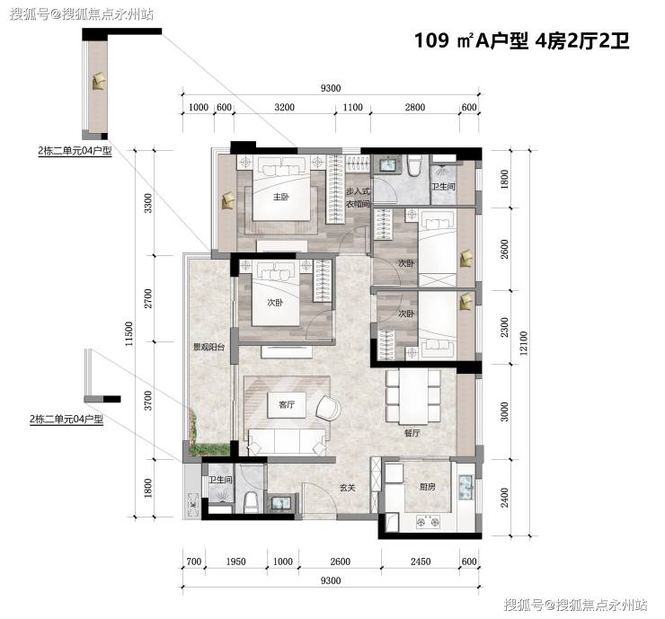 建面约 109 ㎡A户型 4房2厅2卫,总价950万左右,首付约315万