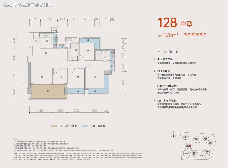 128㎡的4房2厅2卫,设计的是经典竖厅格局,进门入户玄关,客厅3.65米开间,LDKB一体化,S墙设计预留冰箱卡槽位,四开间朝南,动静分区,主卧+1个次卧270度大飘窗,客厅连接次卧出6.15米长大阳台,4个卧室分别做到了主卧20.14㎡/次卧11.28㎡/次卧10.58㎡/次卧6.37㎡(包含墙体飘窗),U型厨房,卫生间干湿分离,得房率约:77.39%(不含赠送),东南朝向。赠送面积21.54㎡,加上赠送得房率94.45%。