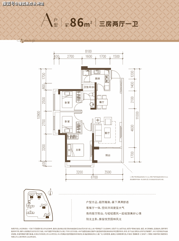 86㎡的3房2厅1卫,设计的竖厅格局,客厅3.5米开间,L型厨房,卫生间三段式分离,正南朝向。