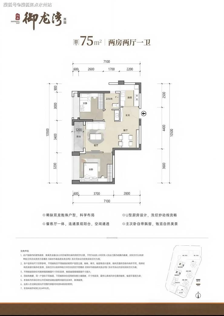 75㎡2房1卫,分布在1栋3/4单元03/06户型,设计的是竖厅稀缺的双龙抱珠格局,客厅开间3.4米,U型厨房,卫生间三段式分离设计,得房率约73.26%(不含赠送),东南或西北朝向,加上赠送得房率约80%。