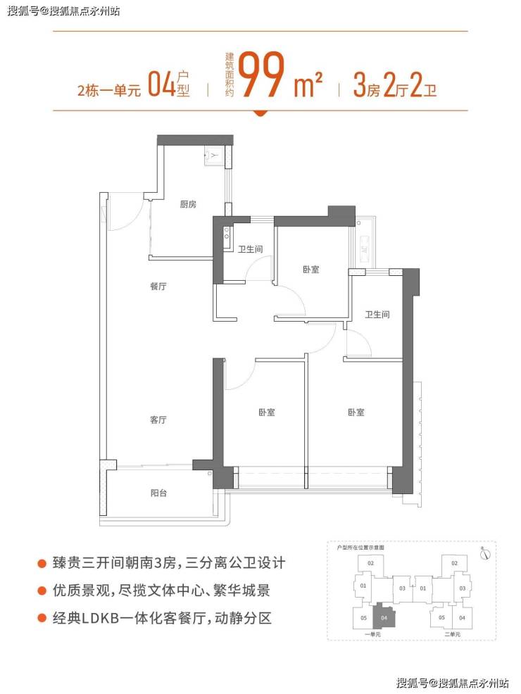 99㎡的3房2厅2卫,设计的是经典竖厅格局,客厅3.35米开间,LDKB一体化设计,动静分区,三开间朝南,U型厨房,公卫三段式分离,得房率:72.3%(不含赠送),西南朝向。