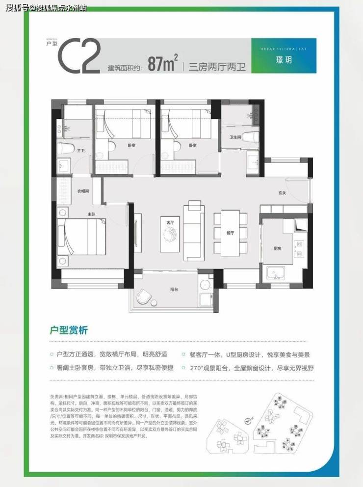 约87㎡三房两卫(1栋2单元03/04户型、3栋1单元05/06户型、3栋2单元04户型、5栋05户型)横厅格局,餐客一体化,卫生间干湿分离设计,有东南朝向、西南朝向。