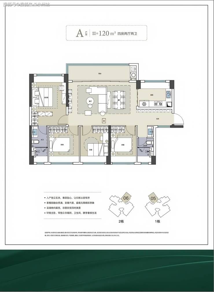 120㎡的4房2厅2卫,设计的是横厅南北通透格局,客餐厅6.7米开间,4个卧室,主卧大套间设计,U型厨房,公卫三段式分离,阳台主朝西南或东南向。