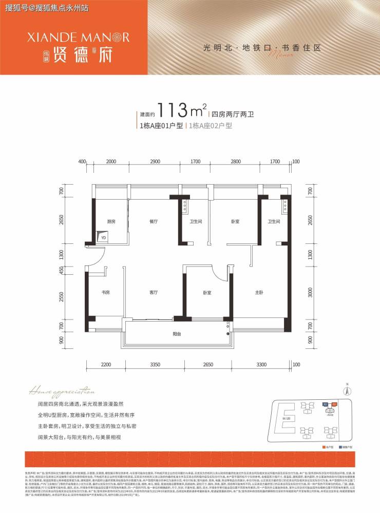 113㎡4房2厅2卫 竖厅南北对流、餐客分离,主次卧均带飘窗、最大化延伸居住空间,超大阳台拥有更佳的采光和景观视野。