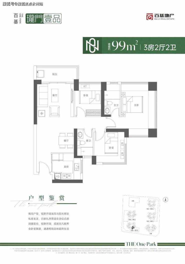 99㎡的3房2厅2卫,设计的是经典竖厅格局,进门入户玄关,客厅3.9米开间,LDKB一体化设计,动静分区,四开间朝南,主卧三面飘窗,U型厨房,卫生间干湿分离,得房率:71.29%(不含赠送),东南朝向。