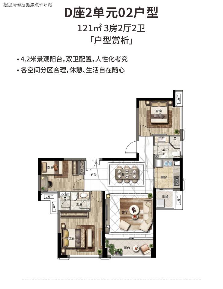 121㎡ 3室2厅2卫:格局方正,南北通透,主卧套房设计,带独立卫浴与衣帽间,景观阳台进深达2.4米,可俯瞰西湾红树林公园或社区园林。