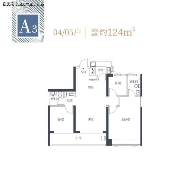 124㎡的3房2厅2卫,设计的是双龙抱珠格局,客厅超大观景阳台,东南朝向